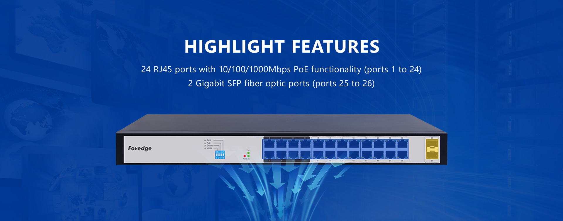 Ürün, ağ erişimi ve uç birleştirme için uygun 24 gigabit PoE bağlantı noktasına ve 2 gigabit SFP optik bağlantı noktasına sahiptir.