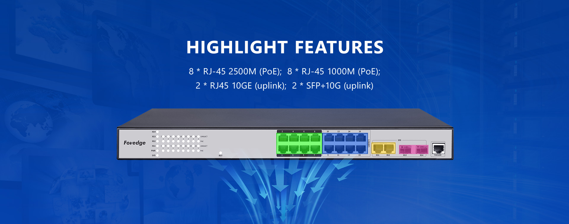 | Ağ İletişimi Arayüz | 8*1000M/2.5G RJ45 bağlantı noktaları( POE) 8*10/100/1000Mbps RJ45 bağlantı noktaları( POE) ● 2 * 10G elektrik bağlantı noktaları ● 2 * 10G SFP + bağlantı noktaları 1*Konsol bağlantı noktası |