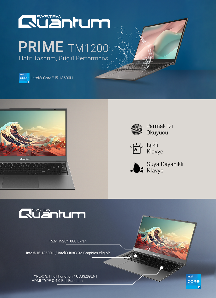 Değerlendirme için bayi girişi yapmanız gereklidir.Quantum Prime TM1200 intel i5-13600H 16GB 512GB SSD HDMI+WiFi+RJ45 ışıklı klavye parmak izi okuyucu 15.6" FHD IPS Freedos Notebook QNNTB10B060719