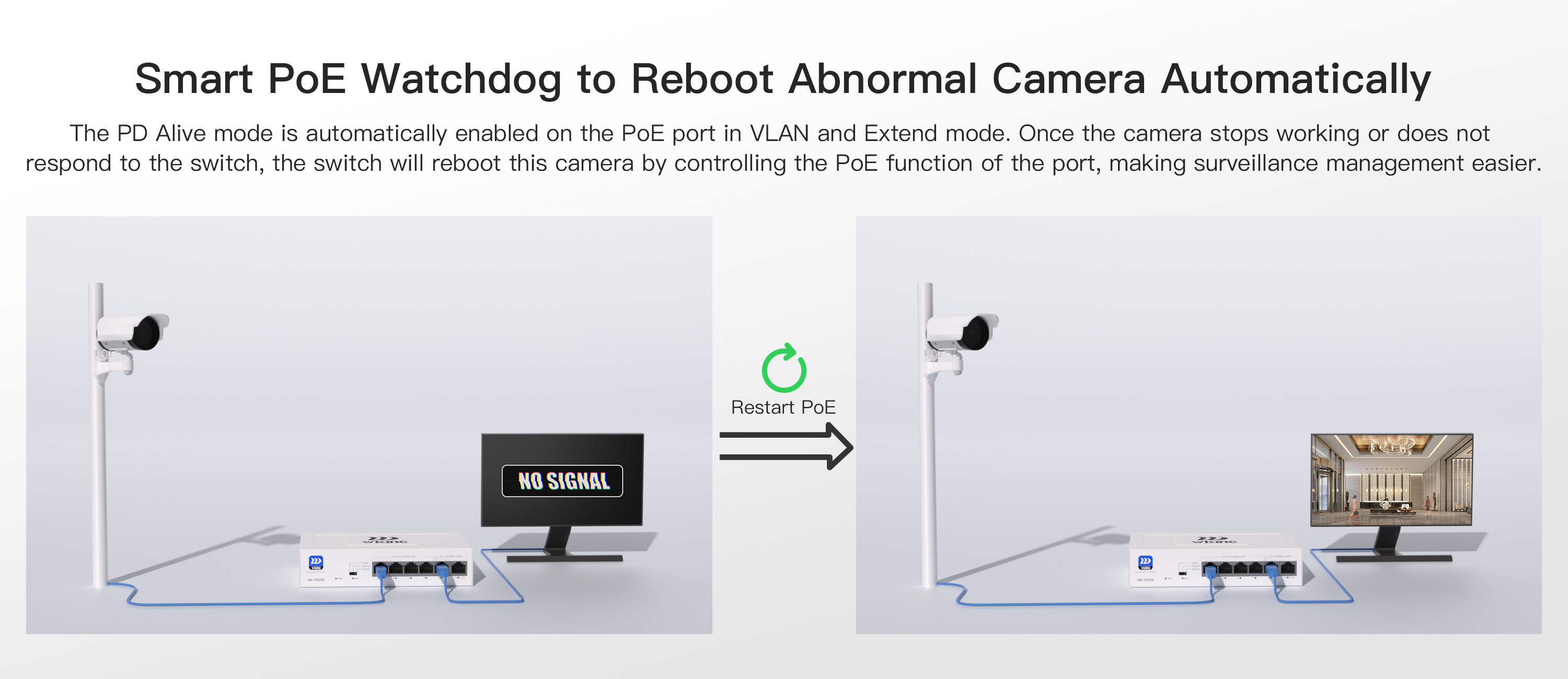 ● PD Alive mode detects and reboots unresponsive PoE-powered devices automatically