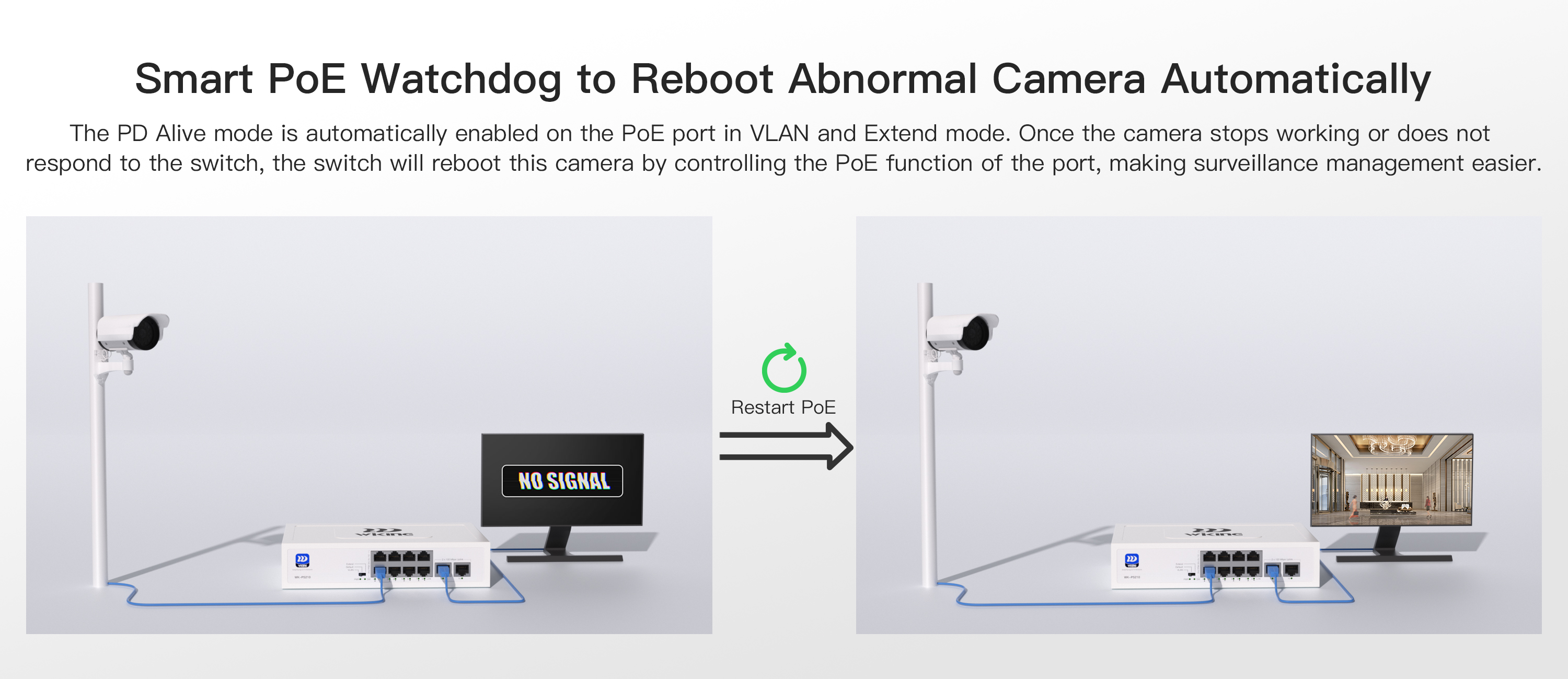 ● PD Alive mode detects and reboots unresponsive PoE-powered devices automatically