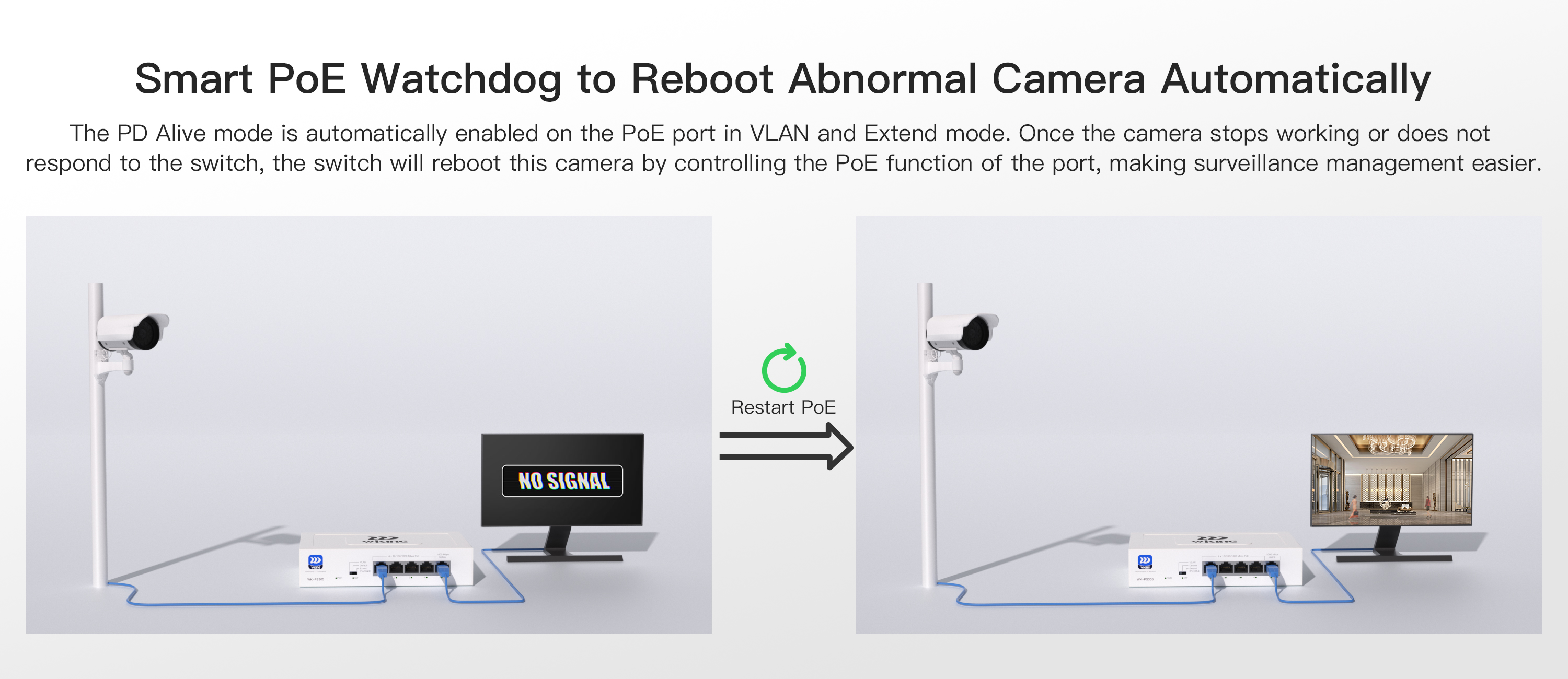 ● PD Alive mode detects and reboots unresponsive PoE-powered devices automatically