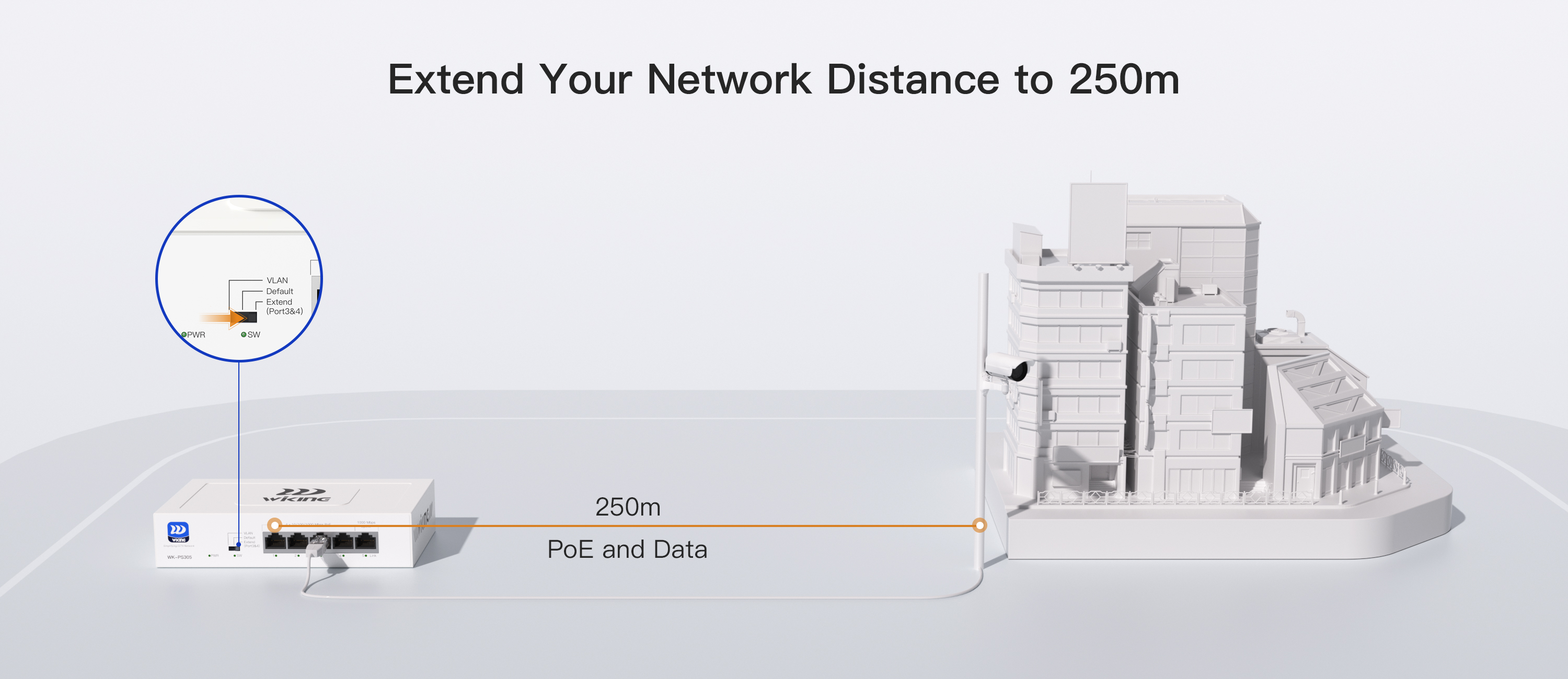 ● Support 250m Extend, Port VLAN, and PD Alive function on DIP Switch